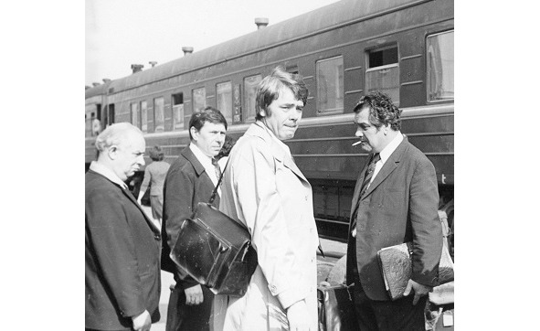 Встреча певца Юрия Александровича Гуляева (в центре, в светлом плаще) на ж/д вокзале в Иванове. Крайний слева – Е. П. Иванов. Май 1977 г. ГАИО