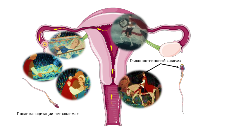Еще одно важное замечание. В сказке Александр Сергеевич не пишет о том, что, когда царевич путешествовал в поисках невесты, на его голове был шлем, а когда он подошел к гробу, то шлема у него уже не было. Великий русский поэт об этом не пишет, но на иллюстрациях к сказкам мы это видим. Что это значит? Помните, я рассказывал, что для защиты головки сперматозоида в придатке яичка он получил шлем из гликопротеинов? Сперматозоид теряет свой шлем во время путешествия по матке и маточной трубе. «Потеря» шлема называется капацитация. Если не «снять» шлем, то рецептор ZP3 не сможет приклеиться к белку ZP3, а это значит, что не будет акросомальной реакции. Короче говоря, в итоге ничего не произойдет.