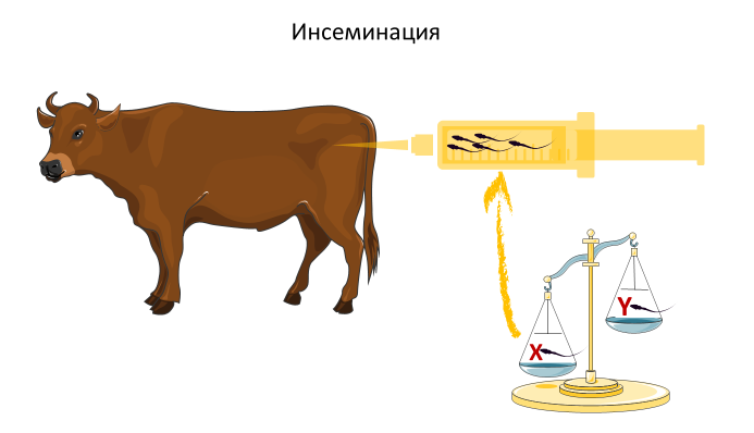 Искусственная инсеменация очень часто используется в животноводстве. Молоко дают коровы, но не быки. Значит, надо, чтобы в потомстве были только тёлочки. Как это сделать? Отбираем только сперматозоиды с женской половой хромосомой и только их вводим в полость матки коровы. Такие сперматозоиды тяжелее, так как в них большая Х, а не маленькая мужская половая хромосома. Конечно, при искусственной инсеменации папа-бык не очень доволен, так как он является только источником сперматозоидов, не видит красавицу-корову и не участвует в процессе оплодотворения. Но его мнение и не является определяющим. Главное, что хозяин быка и коров получает только телочек и развивает свой молочный бизнес (рисунок 28).