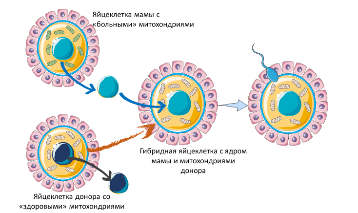 Волшебство, придуманное Робертом Эдвардсом, открыло новые перспективы для семей, в которых женщина больна или является носителем митохондриального заболевания. В случае многих наследственных заболеваний всегда есть шанс не получить «больной» ген, или здоровый ген одного из родителей не даст проявиться болезни. Однако в случае митохондриальных болезней у мамы шанса на удачу и везение нет. Мы все получаем свои митохондрии только от мамы. Так как же помочь парам, в которых у женщины есть митохондриальная болезнь, родить здорового ребенка? Надо позаимствовать яйцеклетку у женщины со «здоровыми» митохондриями, удалить из нее ядро и вместо него поместить ядро яйцеклетки будущей мамы. Далее проводят известную вам процедуру ЭКО, в результате которой образуется зигота из клеток трех родителей (рисунок 30). Наследственная информация в ядре – от мамы и папы, а в митохондриях – от здоровой женщины-донора. Так что поговорка – «третий лишний» не всегда верна.