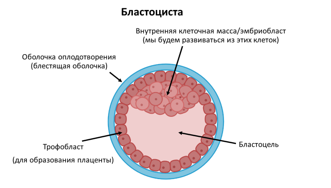 Одни клетки формируют стенку полого шарика-бластоцисты. Это клетки трофобласта, они пойдут на образование плаценты, которая на девять месяцев свяжет нас с организмом мамы. Не всем клеткам удается попасть в трофобласт. Не попавшие в трофобласт клетки «выдавливаются» внутрь бластоцеля и называются внутренней клеточной массой, или эмбриобластом. Эмбриобласт – это не несчастные, а счастливые клетки, потому что многие из них будут образовывать не временные (провизорные) органы внутриутробного развития, такие как плацента, а настоящие клетки органов нашего тела.