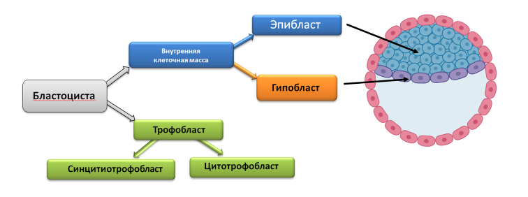 • От трофобласта внутрь полости выступает скопление клеток – внутренняя клеточная масса, или эмбриобласт.