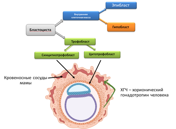 • В трофобласте появляются наружные многоядерные клетки, формирующие синцитиотрофобласт. Контактирующие с бластоцелем клетки трофобласта – это цитотрофобласт.