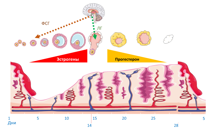 Я уже упоминал, что внутренний слой стенки матки, где мы на 7–10-й день после оплодотворения обосновались, как в пещере, называется эндометрий. Чтобы понять, как устроен эндометрий, расправьте свою ладонь и посмотрите на нее. Ладонь – это эндометрий. Кончики пальцев – это та часть эндометрия, которая направлена в полость матки. Между пальцами есть промежутки. В эндометрии такие промежутки в виде трубочек называются железы эндометрия. Пальцы ладони покрыты кожей, а «пальцы» эндометрия – однослойным цилиндрическим железистым эпителием. Теперь представьте себе, что ежемесячно две крайние фаланги с каждого пальца отваливаются, но потом вырастают заново. В пальцах ладони есть кости, а в «пальцах» эндометрия есть кровеносные сосуды, поэтому, когда теряется верхняя часть эндометрия, из поврежденных сосудов вытекает кровь. Кровь вместе с клетками верхней части эндометрия составляет основную часть менструальных выделений. Теряемая во время менструации, но затем вырастающая вновь часть эндометрия называется функциональным слоем эндометрия. Та часть эндометрия, которая лежит глубже, остается на месте и называется базальным слоем эндометрия. За восстановление функционального слоя отвечают гормоны эстрогены, которые вырабатываются в фолликулах яичника. Выработку эстрогенов и рост фолликула стимулирует фолликулостимулирующий гормон гипофиза (ФСГ).