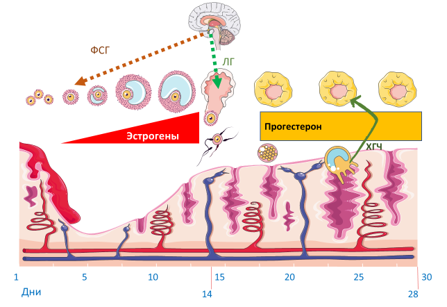 Примерно в середине между двумя менструациями происходит овуляция. Значит, к окончанию менструации в яичнике уже был большой растущий фолликул, поэтому высокий уровень эстрогенов запускает восстановление функционального слоя эндометрия после его потери в менструацию. К моменту овуляции функциональный слой полностью восстанавливается. Гипофиз из огромного фолликула получает высокую дозу эстрогенов и выбрасывает в кровь лютеинизирующий гормон (ЛГ), который «разрывает» фолликул и выпускает из него яйцеклетку. ЛГ заставляет клетки фолликула превратиться в клетки желтого тела. Клетки желтого тела начинают вырабатывать другой гормон яичников – прогестерон. Эстрогены в первой половине менструального цикла стимулировали восстановление функционального слоя. Прогестерон делает эндометрий мягким и влажным, чтобы в него легко было проникнуть бластоцисте. Он, как хорошая горничная в гостинице, «взбивает перину эндометрия», чтобы постояльцу в случае наступления беременности было удобно спать. Если никто не заселился в матку, желтое тело от расстройства усыхает, превращаясь в рубец соединительной ткани, или белое тело. Горничные (прогестерон) уходят на месяц в отпуск, а одноразовая перина за ненадобностью выбрасывается (наступает менструация). Поэтому и говорят о кровавых слезах обманутой матки: она ждала постояльца и подготовилась стать удобной кроватью, хотела быть беременной, но никто не приехал. Как тут не заплакать от обиды?