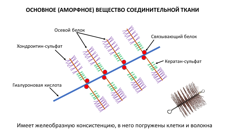 В аморфном веществе четыре гидрофильных гликозаминогликана, которые по химической структуре являются полисахаридами, такими же полисахаридами, как гликоген и крахмал. Три гликозаминогликана связаны с сульфатами. Это хондроитин-сульфат, гепаран-сульфат и кератан-сульфат. Они прикрепляются одним концом к белку, который называют осевым белком. Такие комплексы очень похожи на ершик для мытья бутылок. Щетинки – это сульфатированные гликозаминогликаны, а центральный стержень – это осевой белок. Весь ершик в целом называется протеогликан. Протеогликаны, в свою очередь, формируют щетинки гигантского ершика вокруг стержня гиалуроновой кислоты. Сложенные в «кучу» гигантские ершики очень хорошо связывают воду и формируют гелеобразную основу межклеточного вещества соединительной ткани (рисунок 57).