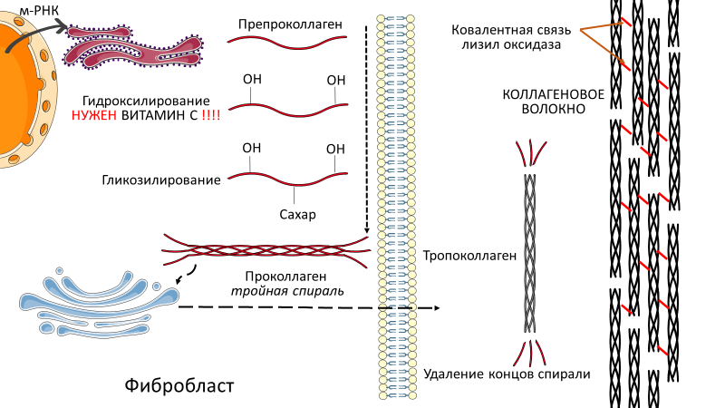 • Гидроксилирование преколлагена происходит с участием витамина С внутри шероховатого эндоплазматического ретикулума, а тройная спираль образуется в комплексе Гольджи фибробластов.