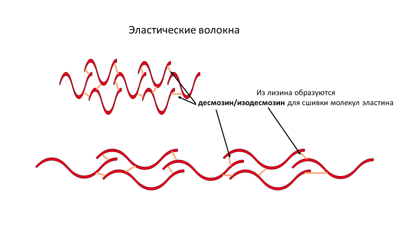 Причиной нарушения образования коллагена может быть не только дефицит аскорбиновой кислоты, но недостаток поступления в организм аминокислоты лизина. Лизин – это одна из восьми незаменимых аминокислот, то есть аминокислот, которые не синтезируются в организме взрослого человека. К счастью, мы получаем её с животной и растительной пищей. Лизин – это важный игрок аминокислотного трио проколлагена. Лизин и пролин гидроксилируются с участием витамина С. Между лизинами образуются ковалентные связи во время сборки коллагеновых фибрилл и волокон. Благодаря лизину еще один вид волокон соединительной ткани приобретает свои уникальные свойства. В данном случае речь пойдет об эластических волокнах.