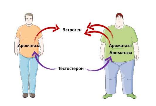 Наверняка все слышали поговорку: «Пока толстый сохнет, худой сдохнет». Поговорка намекает на то, что лучше иметь, чем не иметь запасы жира в организме. С одной стороны, это так. Не случайно на полотнах великих художников эпохи Возрождения вы не увидите субтильных моделей, когда сложно разобраться – парень это или девушка. Полнота женщин всегда и во все времена напрямую ассоциировалась с плодовитостью. Это не случайно. Жир является источником женских половых гормонов-эстрогенов. В жировой ткани есть фермент ароматаза, который превращает мужской половой гормон тестостерон в эстроген (рисунок 60). Чем больше жира в организме, тем больше в крови эстрогенов. При истощении все наоборот. У спортсменок в период высоких физических нагрузок, так же, как у узниц концентрационных лагерей во время второй мировой войны, потеря жира приводила к нарушению менструального цикла. Без жира нарушается выработка женских половых гормонов. Полноценная репродуктивная функция женщин напрямую зависит от женских половых гормонов, а значит, и от количества жира в организме. Думаю, не случайно в последнее время стали популярны конкурсы красоты плюс-сайз моделей.