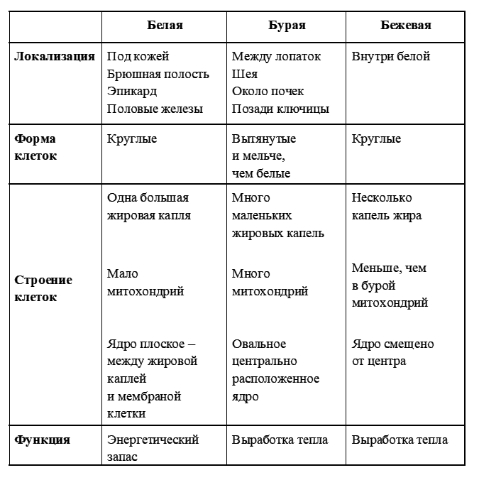 Полного превращения белых жировых клеток в бурые не происходит. Белые жировые клетки «темнеют» и становятся лишь похожи на бурый жир. Потемневшим белым жировым клеткам дали свое собственное название – «бежевые жировые клетки». В бежевых жировых клетках так же, как и в бурых, есть митохондрии. Жир находится в виде нескольких капель. Ядро лежит не в центре, как в бурых жировых клетках, и не под мембраной, как в белых, а в каком-то среднем положении – немного смещено к мембране. Главное же, что эти клетки не просто накапливают жир, но и могут при его расщеплении выделять тепло. У бежевых жировых клеток нет своих излюбленных мест обитания. Они располагаются внутри белой жировой ткани.