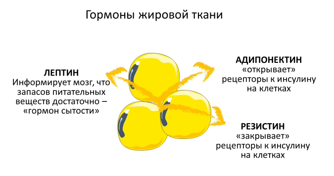• Жировая ткань вырабатывает гормоны лептин, адипонектин и резистин.