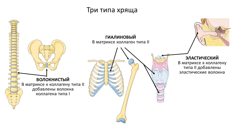 Гибкость и упругость хрящам придают коллаген II типа и хондроитин сульфат. Коллаген II типа – это визитная карточка и обязательный атрибут хряща так же, как коллаген IV типа – обязательный компонент базальных мембран. Существует три типа хрящей – (1) гиалиновый, или стекловидный, (2) эластический и (3) волокнистый (рисунок 63). Во всех трех типах есть второй коллаген. Самым распространенным типом хряща является гиалиновый. Из гиалинового хряща состоял наш эмбриональный скелет, его части навсегда остались в хрящевых частях наших ребер. Все поверхности суставов покрыты гладким гиалиновым хрящом, поэтому мы не скрипим суставами, двигая руками и ногами. Гиалиновый хрящ создает скелет трахеи и крупных бронхов. Эластическим хрящ становится, когда в дополнение к тому, что есть в основном аморфном веществе гиалинового хряща, добавляются эластические волокна. Из эластического хряща состоят ушная раковина и надгортанник. Если кроме упругости необходимо придать хрящу дополнительную прочность, то в основном аморфном веществе хряща появляются волокна прочного коллагена I типа, и это уже волокнистый хрящ. Из волокнистого хряща состоит фиброзное кольцо межпозвоночных дисков, он есть в лобковом симфизе и менисках коленного сустава. Нередко волокнистый хрящ находится в концах сухожилий там, где сухожилия прикрепляются к костям. Здесь волокна коллагена I типа уложены плотными параллельными пучками, как в сухожилиях и связках.