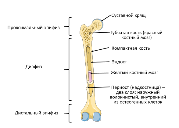 Все хрящи так же, как и кости, покрыты тонкой оболочкой, похожей на капсулу. Такую оболочку называют надхрящницей, или перихондрием, в хрящах, а в костях, соответственно, надкостница, или периостом, снаружи кости. Кроме того, такая же оболочка выстилает полости внутри костей и здесь она называется эндостом. В надхрящнице и надкостнице есть два слоя (рисунок 64). Наружный слой состоит из коллагеновых волокон, поэтому называется волокнистым слоем. Между волокнистым слоем и непосредственно хрящом или костью лежит слой клеток, поэтому этот слой называют клеточным. В клеточном слое хряща находятся хондрогенные клетки, из которых образуются хондробласты. В надкостнице и эндосте в клеточном слое лежат остеогенные клетки, дающие начало остеобластам. Надхрящница и надкостница очень похожи по строению, разница лишь в названиях хондро- и остео-. В обеих оболочках есть кровеносные сосуды и нервные окончания. Поэтому удар по большеберцовой кости, надкостница которой прикрыта только тонкой кожей, бывает очень болезненным. Такой прием часто рекомендуют девушкам для самообороны. Боль на какое-то время отвлечет агрессора и можно будет убежать.