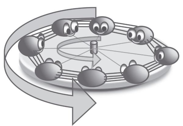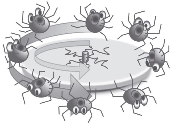 Но на самом деле паучки не нуждаются в осьминоге (тёмной материи). Достаточно им взяться за руки (или на близком расстоянии связаться несколькими паутинками – это аналог силы притяжения между соседними звёздами обратно пропорционально R2, то есть с силой большей, чем паутинка до центра), и можно кататься дальше с повышенными скоростями.