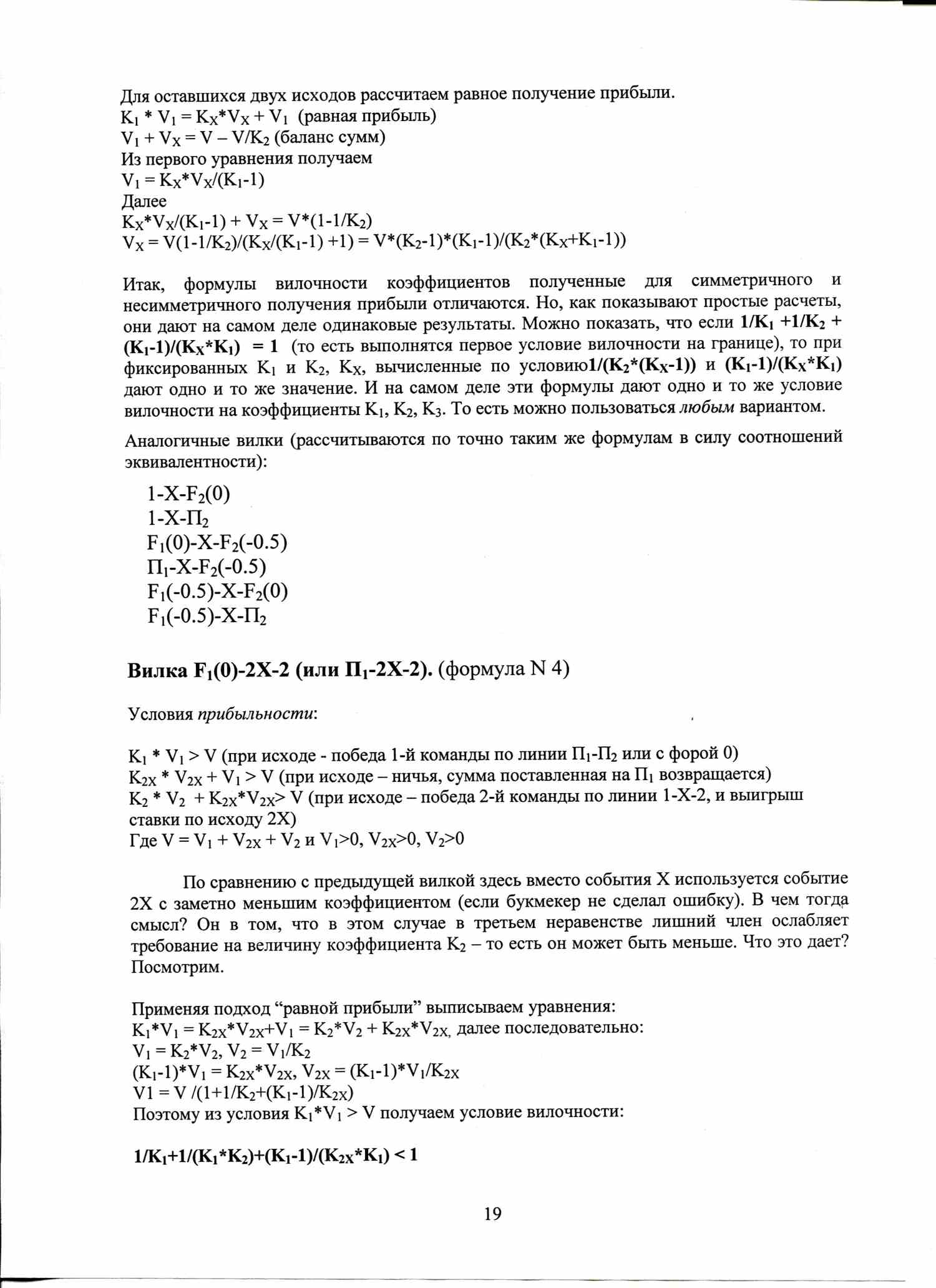 Условие получено без каких-либо предположений о способе разбиения общей суммы по исходам, а значит справедливо для всех без исключения вариантов. В силу изложенного выше вывода это условие является НЕОБХОДИМЫМ для существования “вилки”. Так как если вилка существует (удовлетворяются все исходные “прибыльные” неравенства), то в силу вывода коэффициенты Ki, i=1,N будут удовлетворять последнему соотношению.