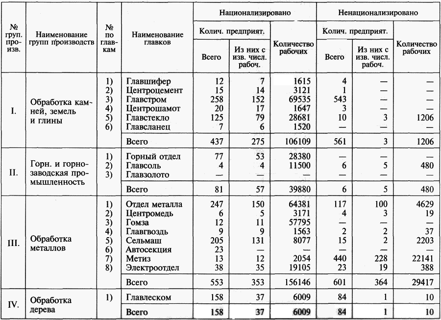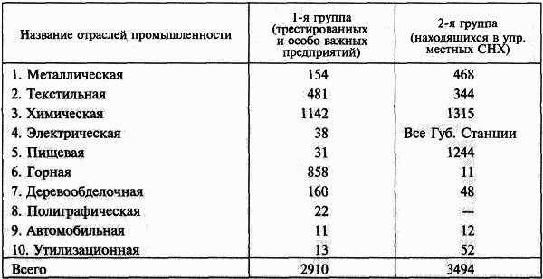 Наибольший интерес представляет, конечно, первая группа, так как в ней сконцентрированы все трестированные предприятия и предприятия особо важного государственного значения. По отдельным отраслям промышленности предприятия этих групп распределяются нижеследующим образом: