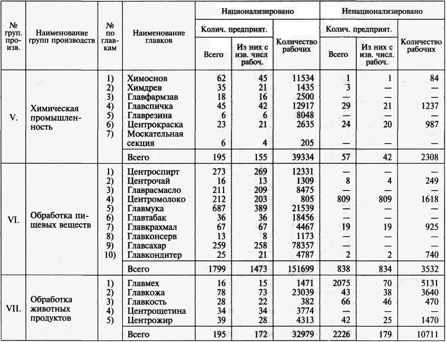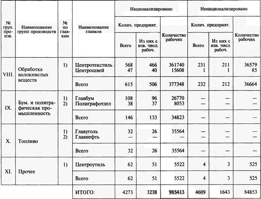 Всего национализировано 6 тыс. предприятий[1]. Из этих 6 тысяч 2910 предприятий находятся в непосредственном управлении центральных органов, т. е., иными словами, в непосредственном управлении В.С.Н.Х. Эти 2910 предприятий финансируются, снабжаются как сырьем, так и топливом непосредственно распоряжениями из центра. Точно так же как и заводоуправления на предприятиях этой группы, а также центральные управления назначаются центральными органами В.С.Н.Х. или непосредственно президиумом В.С.Н.Х. по соглашению с Ц.К. соответствующего профессионального союза.