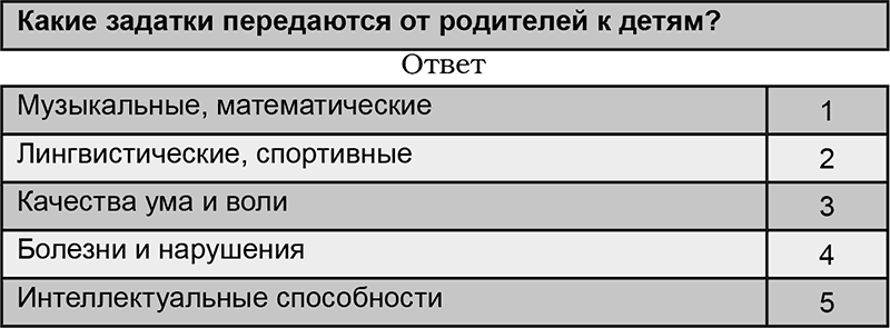 Чрезвычайно важен вопрос о наследовании интеллектуальных качеств. Что наследуют дети – готовые способности к определенному виду деятельности или только предрасположения, задатки? Рассматривая способности как индивидуально-психологические особенности личности, как условия успешного выполнения определенных видов деятельности, педагоги отличают их от задатков – потенциальных возможностей для развития способностей. Анализ фактов, накопленных в экспериментальных исследованиях, позволяет ответить на поставленный вопрос однозначно – наследуются не способности, а только задатки.