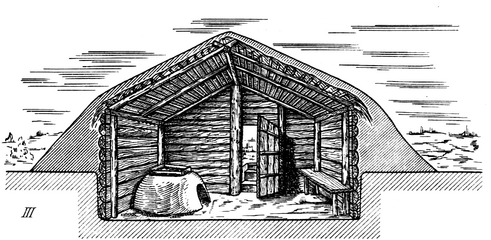 Аналогичные остатки очагов археологи находили и на правобережье Днепра, под нынешним Житомиром и у Западного Буга39. Даже для выпечки хлеба они были мало приспособлены. Для этого тогда существовали так называемые «хлебные» печи. В южнорусских областях их устраивали на склонах оврагов и косогоров в виде пещер, вырытых в глине. В такой печи разжигали сильный огонь, затем выгребали угли, сажали внутрь хлеб и закрывали устье печи камнями и глиной, чтобы сохранить жар40.