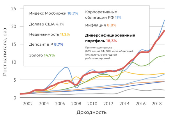 Доходности классов активов в России, 2002—2019 гг. Среднегодовая рублевая доходность за 18 лет