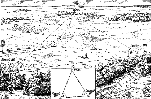 Ясно, что цель окажется в точке пересечения обеих линий, показывающих направление «взгляда» того и другого наблюдателя.