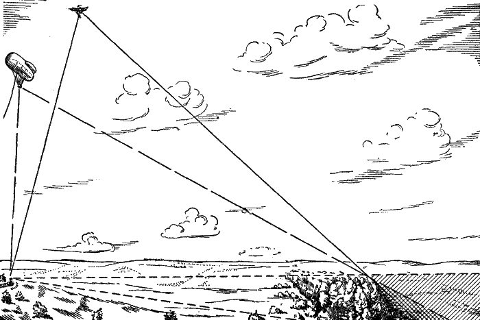 С аэростата можно наблюдать многое из того, чего не видно с наземных наблюдательных пунктов, что скрыто в складках местности и за местными предметами. Аэростат дает возможность определить не только направление на стреляющую батарею, но достаточно точно и место ее расположения.