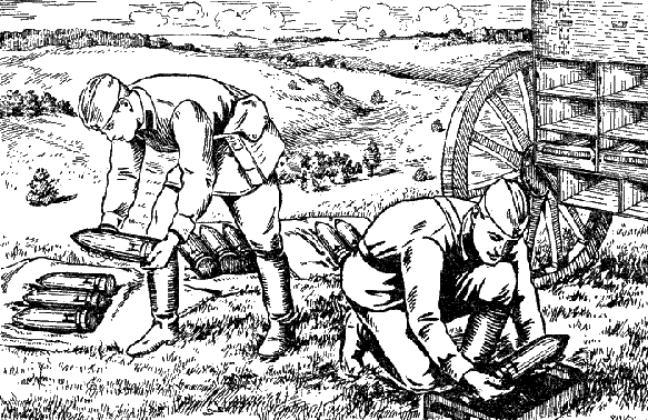 Рис. 197. Бойцы подготавливают снаряды к стрельбе: они сортируют их по весу