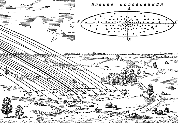 Рис. 199. Рассеивание снарядов; справа вверху – примерное распределение сотни воронок