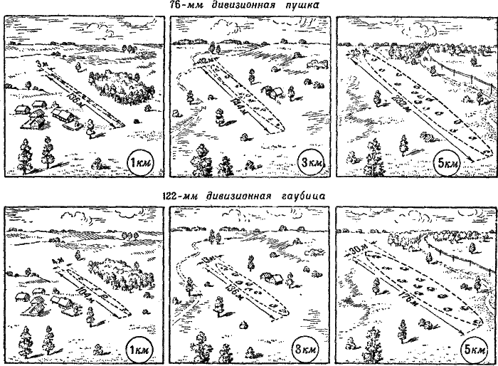 Рис. 201. Чем больше дальность стрельбы, тем больше и рассеивание. У гаубицы рассеивание снарядов по дальности меньше, чем у пушки