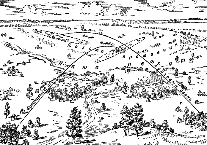 Когда цель находится недалеко от нашей пехоты, некоторые снаряды вследствие рассеивания могут не долететь до цели, упасть ближе, чем нужно, в наше расположение. Так, например, если наша артиллерия ведет стрельбу через нашу пехоту, примерно на 3-4 километра, то находиться ближе 200—250 метров от цели уже опасно. В этом случае наша пехота может быть поражена не только осколками (от них еще можно укрыться), но и целыми снарядами. Поэтому, как только наша пехота подойдет к цели ближе чем на 250 метров, артиллерия, стрелявшая через пехоту, сейчас же переносит огонь несколько дальше и предоставляет пехоте бороться с ближними целями своими средствами.