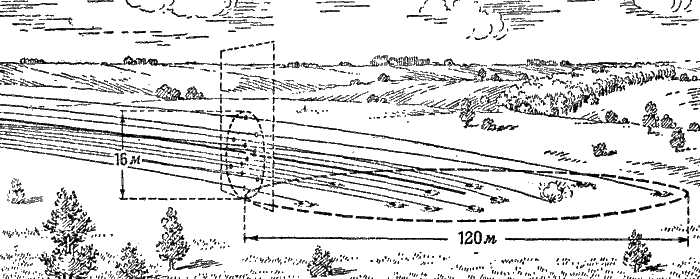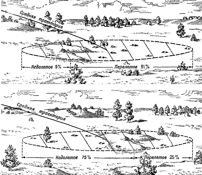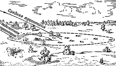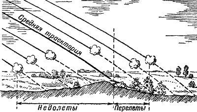 Таким образом, по одному недолету или перелету еще нельзя с уверенностью решить, где именно проходит средняя траектория, какой прицел будет правильным. Это можно решить только тогда, когда будет выпущено несколько снарядов.