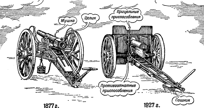 Рис. 215. Как изменилось артиллерийское орудие за 50 лет