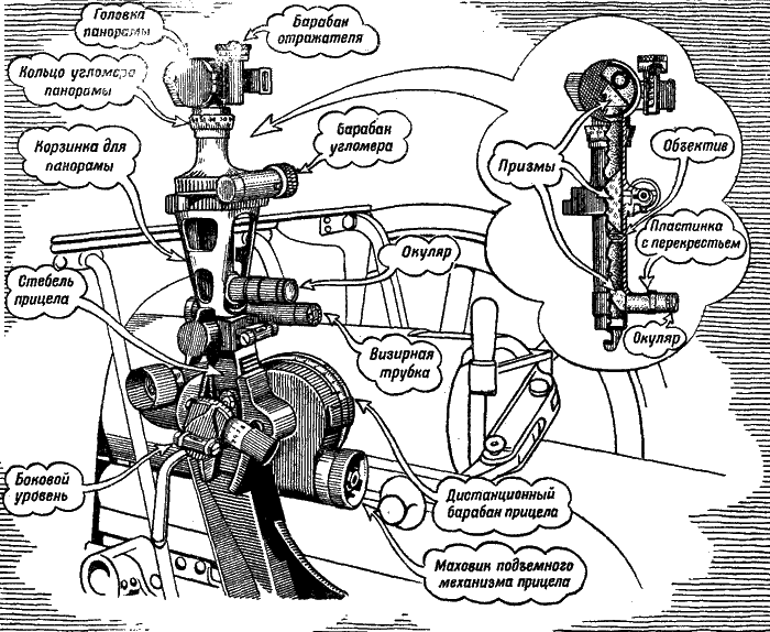 Поворачивая головку панорамы, можно, таким образом, видеть местность вправо, влево и даже сзади от орудия. Наводчику при этом вовсе не требуется поворачивать свою голову: он продолжает смотреть в окуляр, который неподвижен и направлен всегда параллельно стволу орудия.