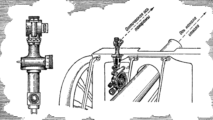 Рис. 218. Панорама установлена для прямой наводки. Оптическая ось панорамы параллельна оси канала ствола
