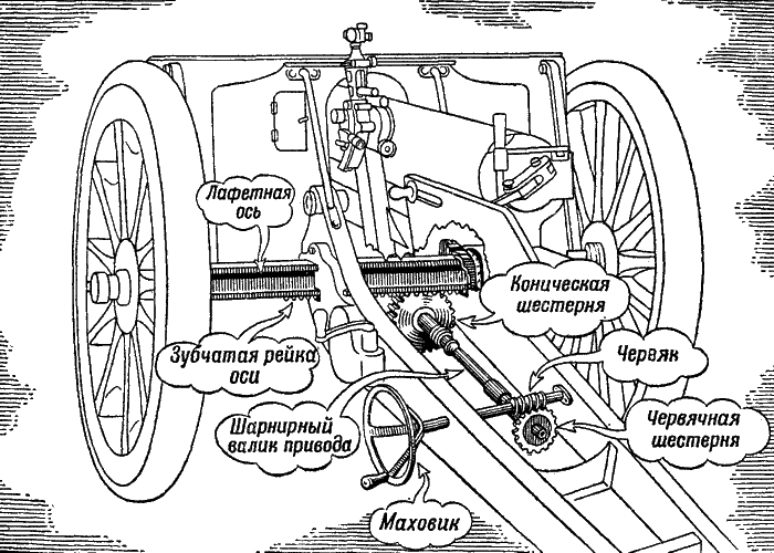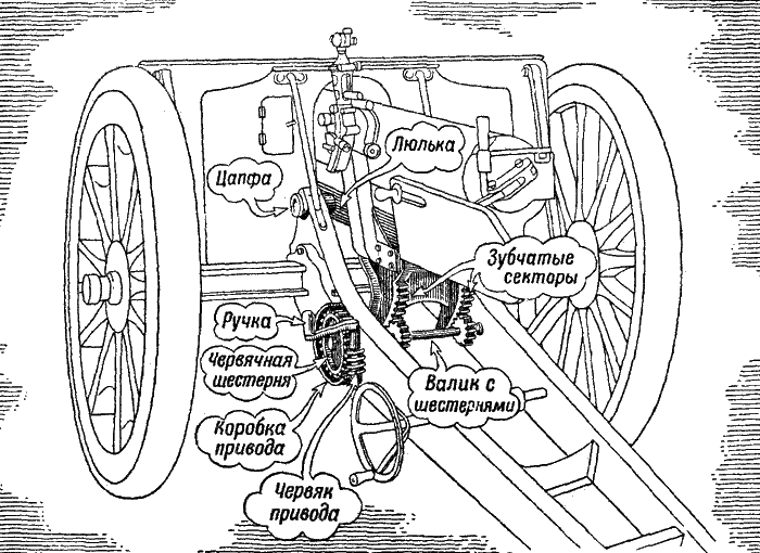 Рис. 226. Так устроен подъемный механизм полковой пушки (схема)
