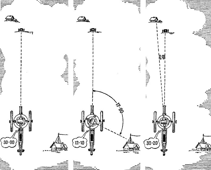 Теперь вы направляете головку панорамы сначала, положим, на мачту антенны справа сзади, а потом на правый край дома, что левее цели (рис. 222). Когда перекрестие панорамы совпадет с мачтой антенны, показание колец будет, скажем, 12-10, а когда перекрестие совпадет с краем дома, показание колец будет 30-20.