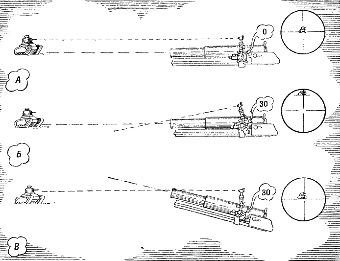 Рис. 225. Вертикальная наводка орудия (придание орудию угла возвышения) по видимой от него цели: А – прицел 0 – оптическая ось панорамы параллельна оси канала ствола; В – прицел 30, соответствующий расстоянию до цели (танка); цель сошла с перекрестия панорамы: В – при прицеле 30 орудие наведено в цель, то-есть ему придан нужный угол возвышения