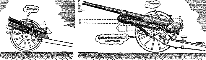 Рис. 227. Короткий ствол полковой пушки уравновешивается без специальных механизмов. Для уравновешивания длинного ствола дивизионной пушки применяется специальный механизм