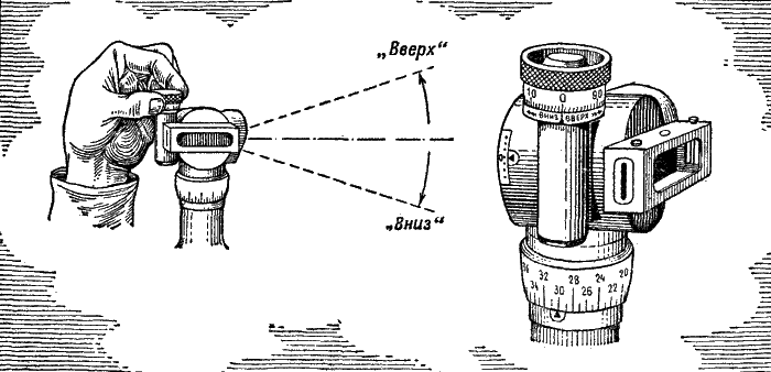 Рис. 228. Чтобы направить оптическую ось панорамы выше или ниже горизонта («вверх» или «вниз»), вращают барабан, отражателя в соответствующую сторону