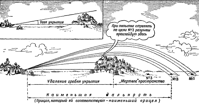 Например, угол укрытия – 40 делений угломера; половина его – 20; до гребня укрытия – 6 делений прицела. Следовательно, наименьший прицел равен 26 делениям прицела.