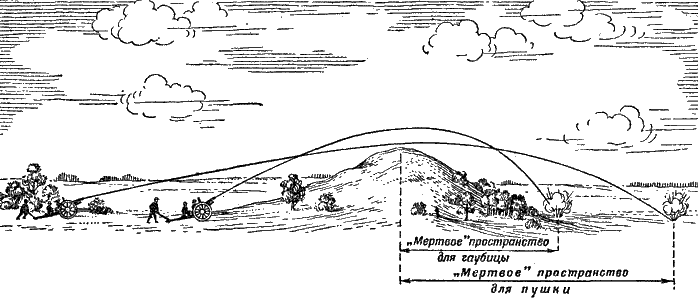 Рис. 250. При расположении за одним и тем же укрытием мертвое пространство у гаубицы меньше, чем у пушки