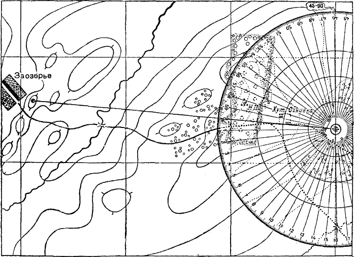 Прочертив на карте прямые линии, соединяющие каждый из ориентиров с батареей, он измерил линейкой дальности до каждого ориентира (рис. 256); прикладывая затем к карте целлулоидный круг так, чтобы ноль был направлен в соответствующий ориентир, он читал, какое деление круга приходится против направления на север, и записывал буссоль этого ориентира (рис. 257).