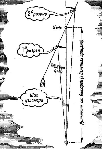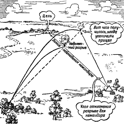 Рис. 253. Угол отклонения разрыва от цели не одинаков для командира и для батареи, поэтому снаряд и не послушался команды – второй разрыв оказался правее цели на 0-40