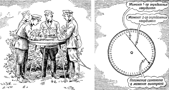 Рис. 292. Достаточно два раза определить координаты самолета и нанести их на зенитный планшет, чтобы можно было уже определить скорость самолета и его положение в момент выстрела