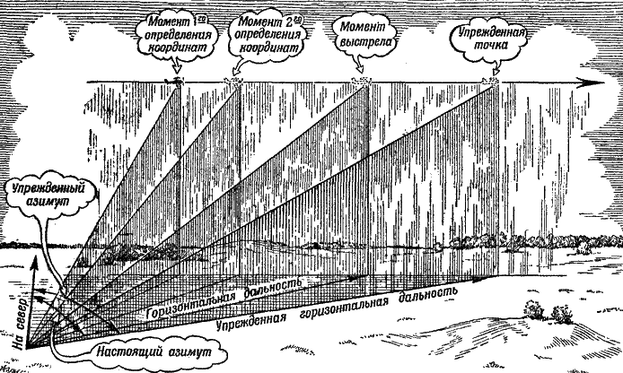 Таким образом, мы знаем уже очень многое о нашей цели. Нам известно, на какой высоте и с какой скоростью летит самолет, знаем мы и направление, в каком он летит. Остается лишь решить, где окажется самолет в момент выстрела и в момент разрыва снаряда.