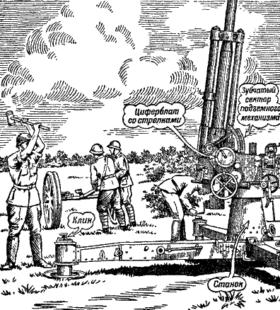 Рис. 297. Специальными клиньями «прибивают» станины орудия к земле