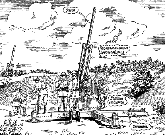 Теперь ясно видно, что станки этих орудий имеют вид тумб, опирающихся на четыре станины, растопыренные подобно паучьим ножкам. Этими «ножками» станки и вцепляются в землю.