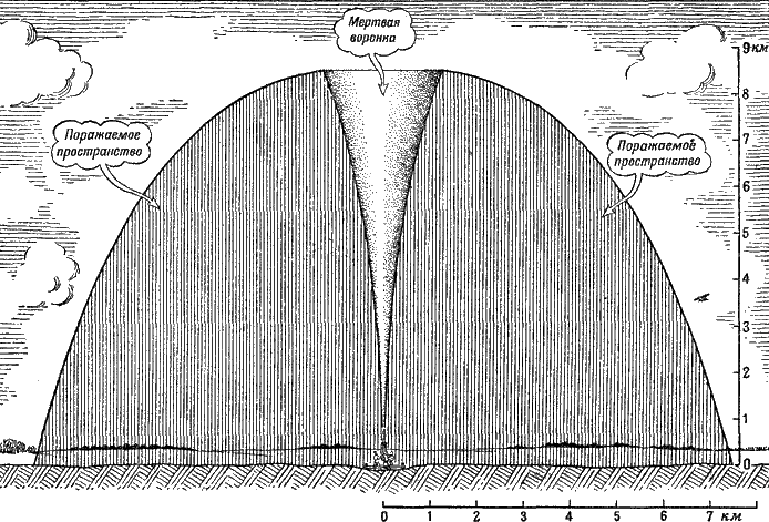 «Таблицы стрельбы» показывают: самолеты находятся там, где «приспособленная» батарея уже не может попасть в них своими снарядами, – самолеты ушли в «мертвый сектор обстрела» (рис. 288). Мы подняли орудие на зенитный станок и этим увеличили его наибольший угол возвышения, способность стрелять круто вверх; но, к несчастью, при этом мы увеличили также и наименьший угол возвышения. Уменьшилась мертвая воронка, но появился другой недостаток: мертвый сектор.