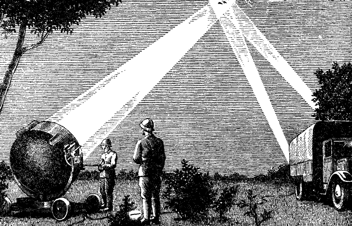 Враг пойман. Теперь ему не вырваться из цепких световых клещей. Прожектор-искатель, связанный со звукоулавливателем, тухнет; он сделал свое дело и готов снова к поимке другого самолета.