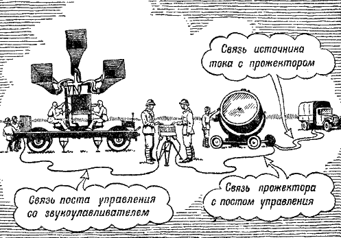 Вот как это достигается. С постом управления соединен проводами не только звукоулавливатель, но и прожектор-искатель (рис. 306). Взглянув на шкалы, командир узнает, куда направлен в этот момент прожектор, насколько его направление отличается от направления звукоулавливателя. Вращая маховики, командир заставляет электромоторы повернуть прожектор в ту же сторону куда направлен звукоулавливатель, то-есть на самолет.
